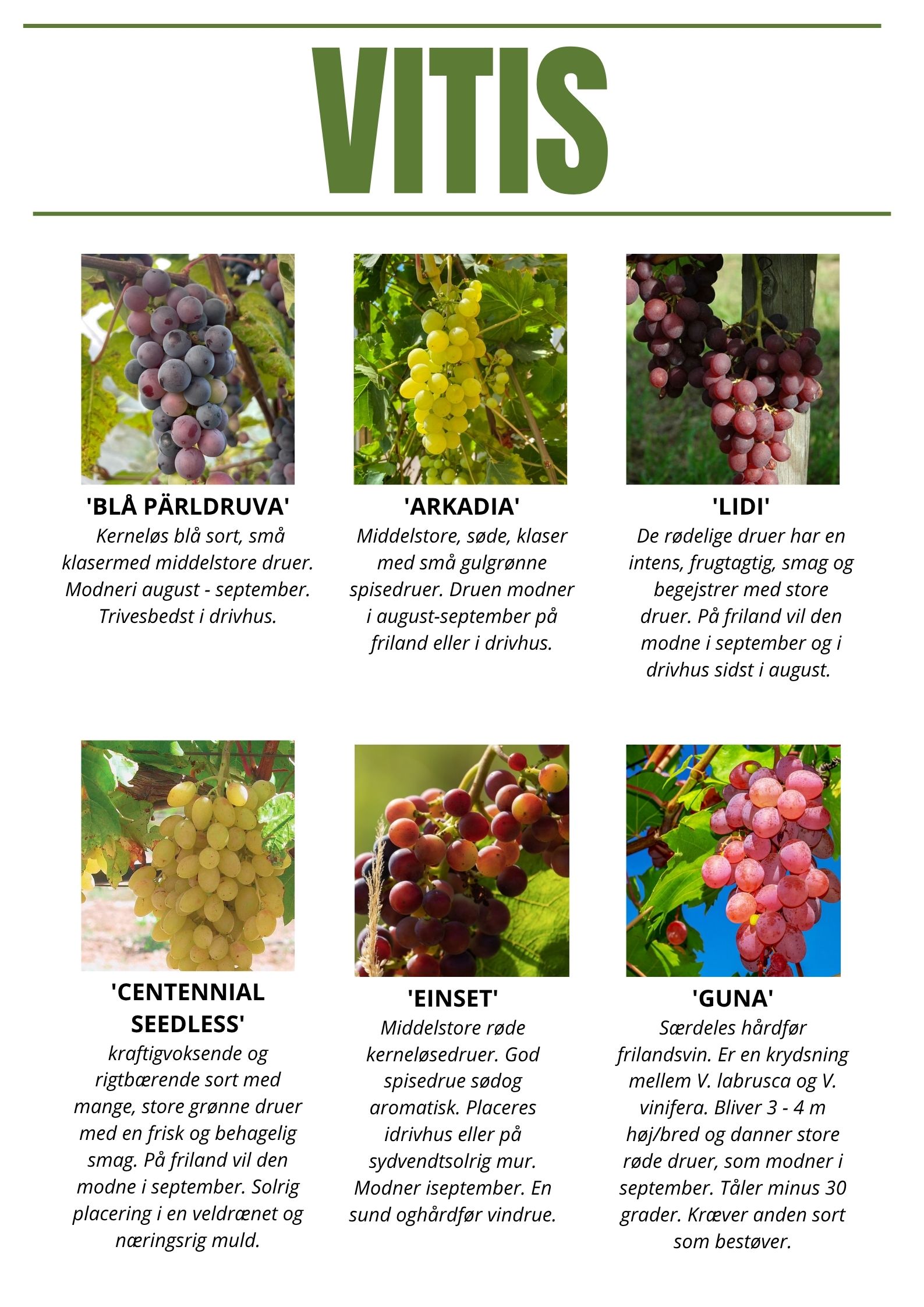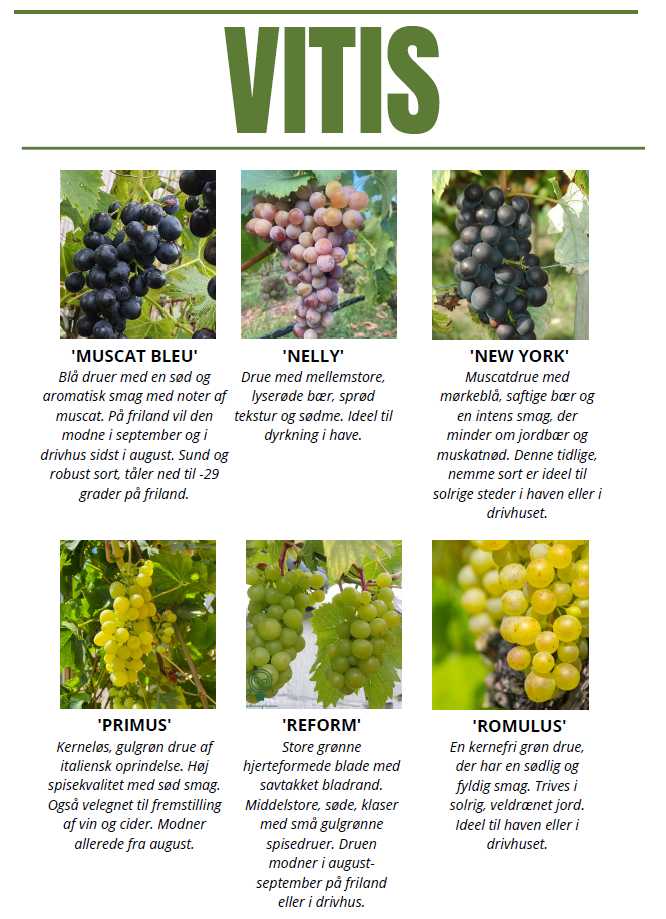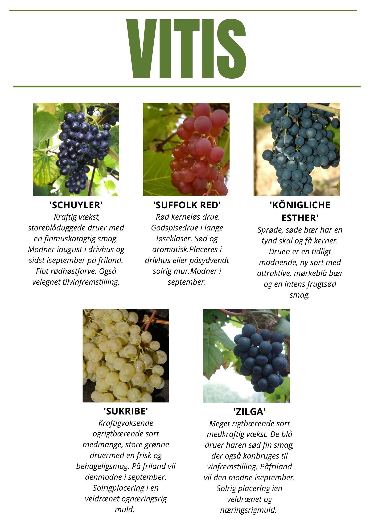 Læs kort om de sorter vi har i vores Vitis sortiment og bestil dem hjem til dit havecenter til foråret 2026.