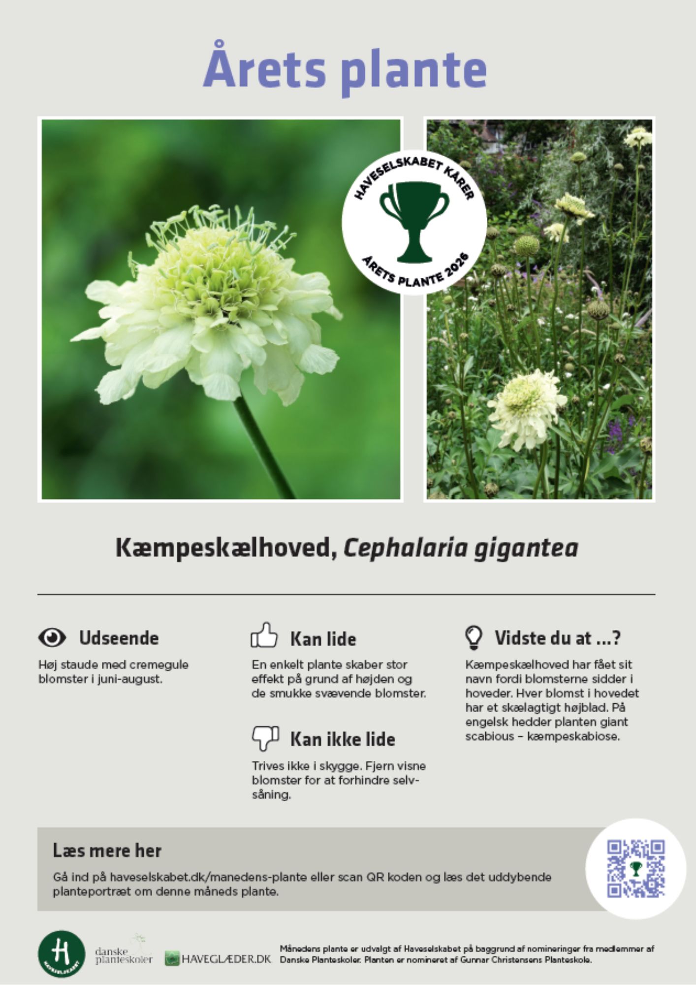 Haveselskabet har kåret Årets plante 2026. De nomminerede var de otte planter der var kåret til Månedens plante i 2025. Efter en afstemning blandt Haveselskabets medlemmer, kan vi nu afsløre vinderen: Cephalaria gigantea.