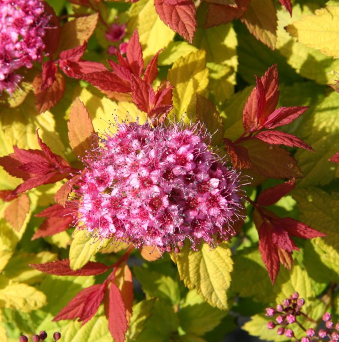 En 50 - 75 cm høj busk med gulgrønt løv. Bladene er rødlige når de springer ud. Får store mørkrosa blomster i juli - aug. Placeres solrigt i almindelig veldrænet havejord. vinterhårdfør. |