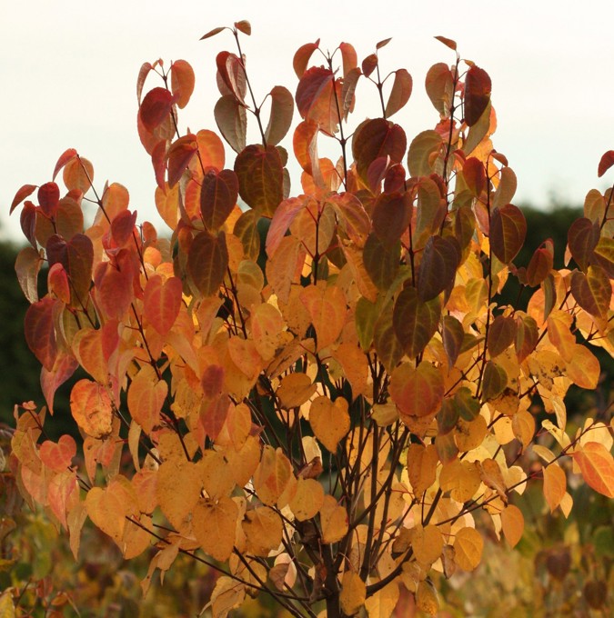 Spinkelt, ofte flerstammet træ med uanselige blomster i maj. Har hjerteformede blade, rødbrune i udspring, gul eller rød høstfarve. Dufter af brunkager i efteråret. Placering i sol og veldrænet, fugtighedsbevarende jord. |