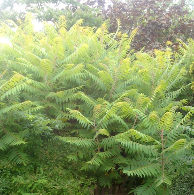 Bredt flerstammet lille træ med oprette lodne grene. Bliver 3 - 5 m højt og bredt. Store sammensatte blade, der i efteråret får flotte røde høstfarver. Gulgrønne blomster midt sommer omdannes til mørkerøde frugter. Placeres i sol eller halvskygge. Plantes i alm. veldrænet næringsrig jord. Danner en del rodskud. |