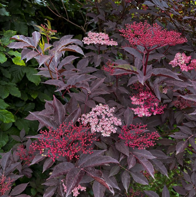 Flot 2-3 m høj og bred busk eller lille træ med purpurfarvede hyldetræsformede blade. Tåler beskæring. Danner smukke skærme af rosa blomster i maj - juni måned. De er spiselige og efterfølges af få sorte bær, der modner i oktober. Trives i sol og halvskygge. Plantes i almindelig jord og er robust og fuldt hårdfør. |