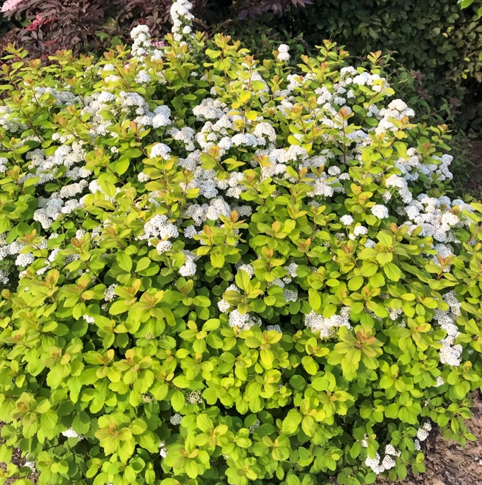 Lav tæt busk, højde 60 cm. Smukkegyldengule blade i foråret mere gulgrønne henover sommeren, senere rødorange høstfarver. Blomstrer i maj med mange hvide blomster. Meget hårdfør. |