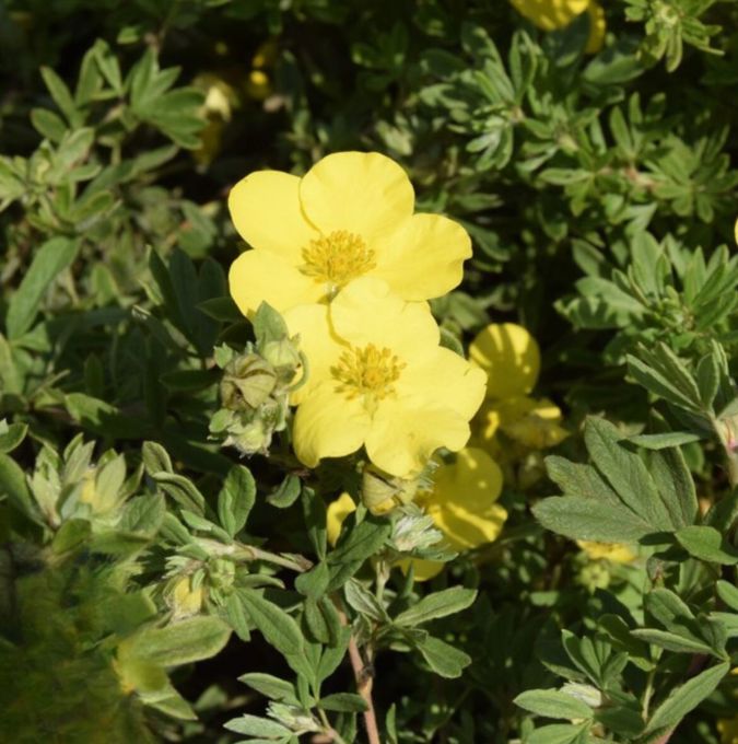 Tætgrenet busk, ca. 40 cm. høj og bred, med mange store og lysende gule blomster fra juni - oktober. Trives bedst på en solrig placering i en alm. god muld. Både velegnet som lav uklippet hæk og som solitær. |