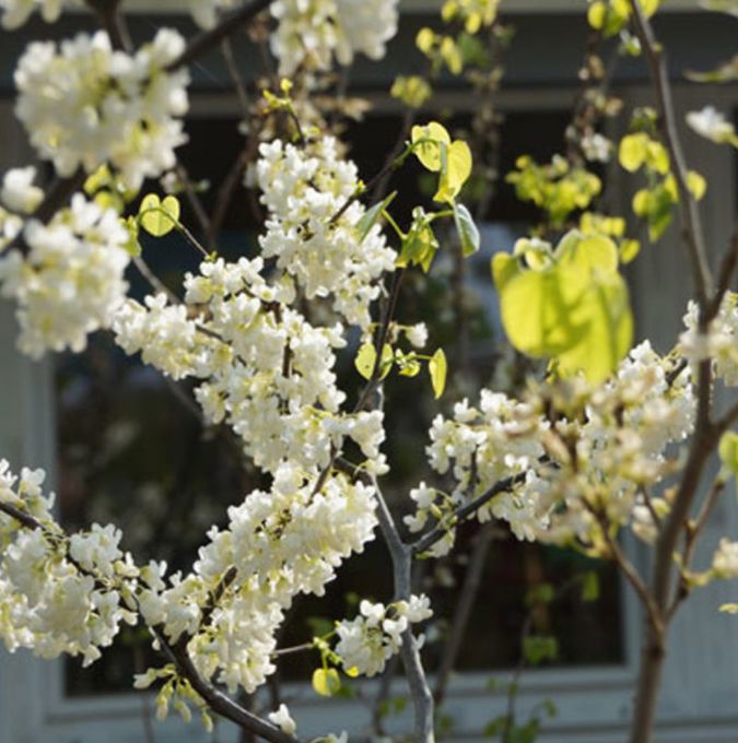 Judas-tre som blomstrer vakkert om våren med hvite blomster. Løvfellende tre som kan bli opptil 3 meter høyt. Blomstrer i mai-april. Trives i sol. H6. |