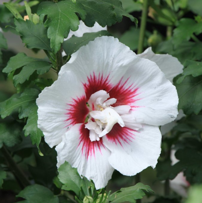 Syrisk rose. Mellomstor, stivt forgrenet busk med opprett vekst. Sent løvsprett med mindre, mattgrønne blader. Store hvite blomster med rød midt på sensommeren. Dekorative frøstander. Vokser på en solrik, varm plass i godt drenert, næringsrik jord. |