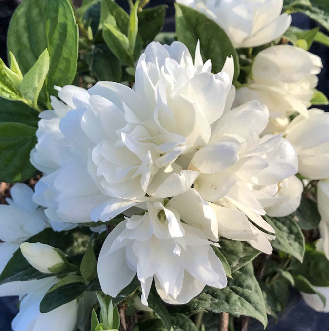 Kompakt, ca. 1 meter høy løvfellende busk. I juni blomstrer de herlig duftende, hvite, halvfylte blomstene. Blomstrer på fjorårets grener, evt beskjæring bør gjøres umiddelbart etter blomstring. Snowbelle er en svært robust sort som tåler både varme og kulde. Plantes i sol eller halvskygge i vanlig hagejord. H6. |