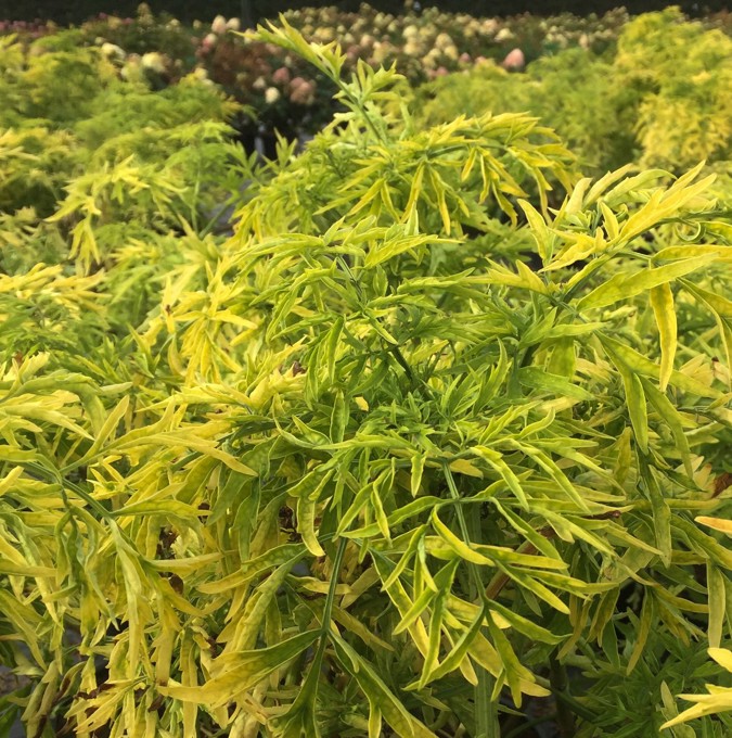 En slank og elegant hyll med gulgrønne, flikete blader. De nye bladene har en lysende gyllen farge. Store hvite, velduftende blomsterklaser i juni. Får noen få bær som modnes i oktober. Både blomster og bær kan brukes til saft. Trives best på en solrik plass i god, næringsrik jord. H4. |