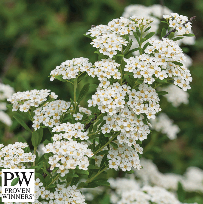 Kompakt og delikat spirea med overhengende greiner som i juni fylles med små hvite blomster i klaser. Vakre blågrønne blader. Blir ca. 1 meter høy. Plasseres i sol eller halvskygge og plantes i vanlig veldrenert hagejord. H4. |