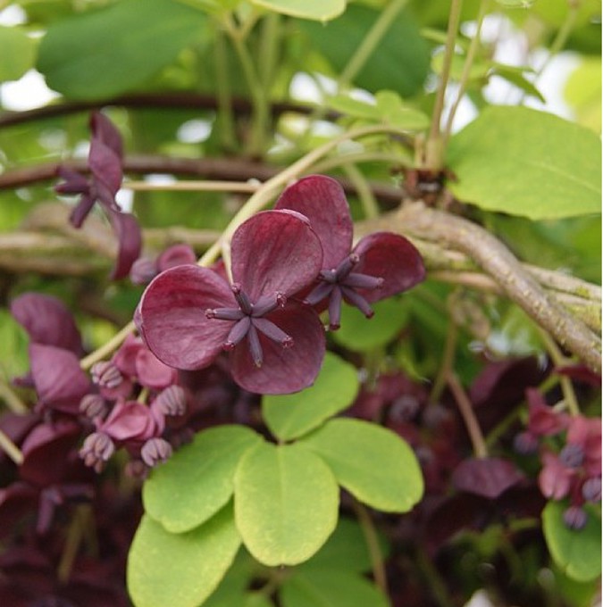 Hurtigvoksende, halvgrønn slyngplante som kan bli 6 - 10 m. Blomstrer om våren med sjokoladefargede, duftende småblomster. Kan danne frukt hvis to sorter. Spiselig skoghageplante. Tørketolerant når den er veletablert. Kan plasseres i sol eller skygge. Plantes i vanlig veldrenert hagejord. H4. |