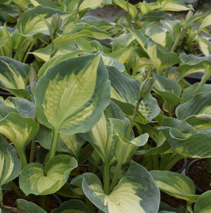 Flerårig. Bredbladet hosta. Vakkert fargespekter fra blågrønn, limegrønn til kremhvit. Litt rufsete, tykke blader som kan gjøre den mindre attraktiv for snegler enn andre sorter. Ca. 60 cm høy og bred. Hvite blomster fra midten av sommeren. Trives i skygge til halvskygge i fuktig, godt drenert jord. H7. |