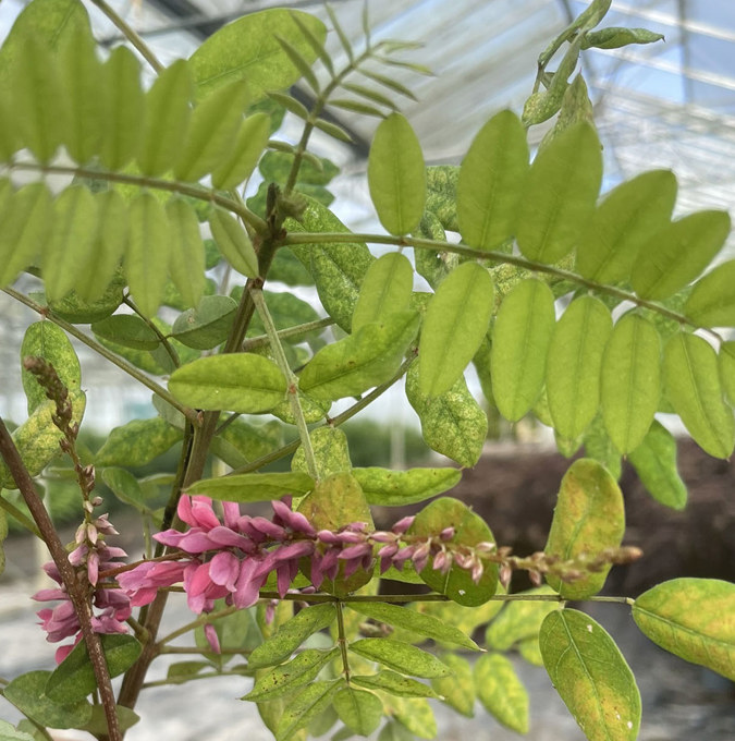 Ärtblomsliknande rosa blommor från juli-oktober. Tunna lätt överhängande grenar med små avlånga gröna blad. Lövfällande buske,som ofta frysen tillbaka, men bryter från basen igen på våren. Härstammar från Kina. Trivs i full sol och planteras i god väldränerad jord. Zon 1-3. |