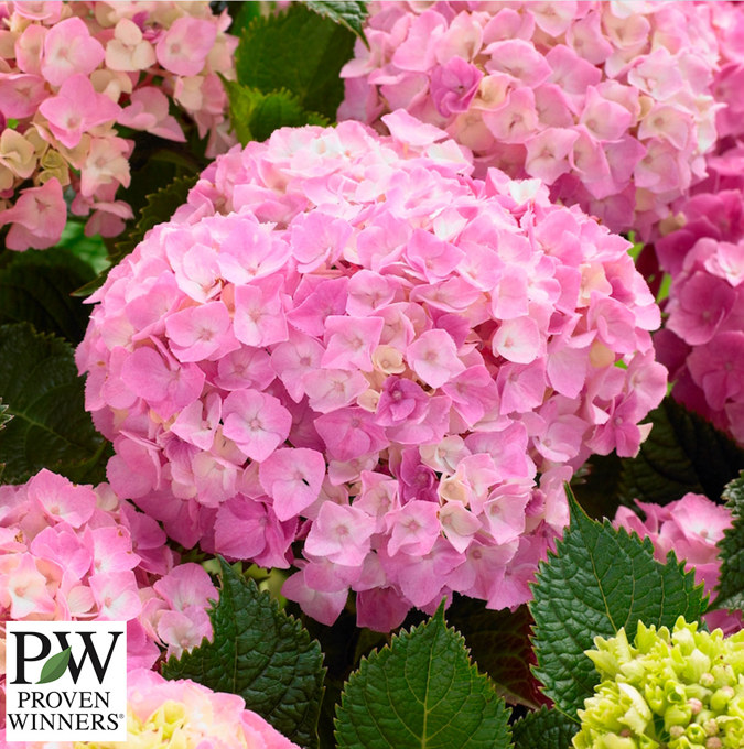 Rikblommande hortensia med rosa blommor från juli till november. Växer kompakt och blir 90 cm hög och 70 cm bred. Trivs i sol-halvskugga och är särskilt lämplig för plantering i kruka. Blommar på fjolårsknopparna. |