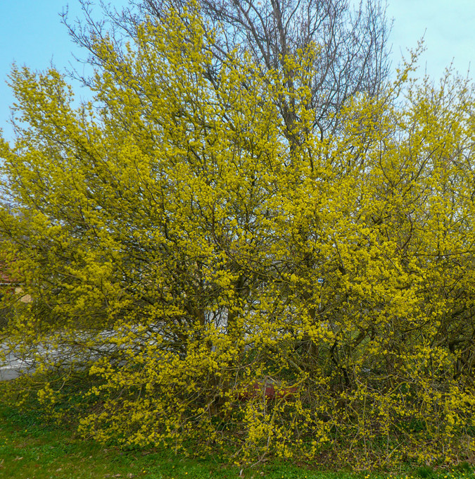 Långsamtväxande, stor buske/ litet träd ca 4-6 m hög. Gula blommor på bar kvist i mars-april. Röda, ätliga frukter. Mycket anspråkslös, växer i både sol och skugga. Lämplig som vindskydd, solitär eller i grupper i stora trädgårdar och parker. Tål industrimiljö. Lämplig att driva. Zon 1-3. |