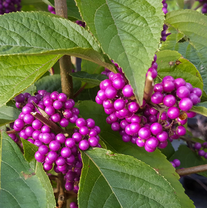Buske ca. 2 m hög med lilarosa blommor och senare violetta dekorativa små bär i augusti-november. Trivs i full sol i ett lugnt och skyddat läge i en något sur jord. Passar bra som solitär eller i grupper. Vacker och speciell buske med sina fina frukter! Zon 1-2. |