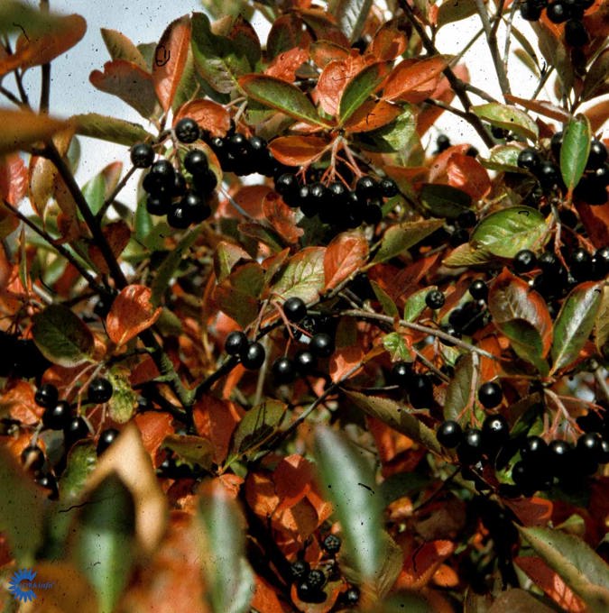 1 m. Blankt mörkgrönt bladverk, orange höstfärg. Vita blommor i skärmar i juni. Svarta ätliga frukter. Trivs i sol-halvskugga i vanlig trädgårdsjord. Robust. Utmärkt till buskage, i grupper och till friväxande häckar. Zon 1-4. |