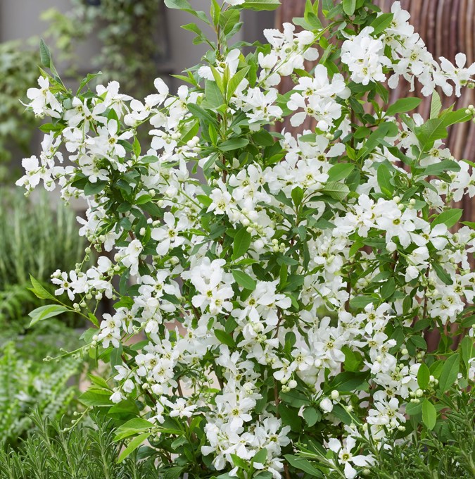Upprättväxande buske, ca. 2 m hög. Blomknopparna är svagt rosa. Dubbla vita blommor från maj-juni. Nya skott är rödgröna när de slår ut. Trivs i sol-halvskugga i vanlig trädgårdsjord eller i en surjordsrabatt. |
