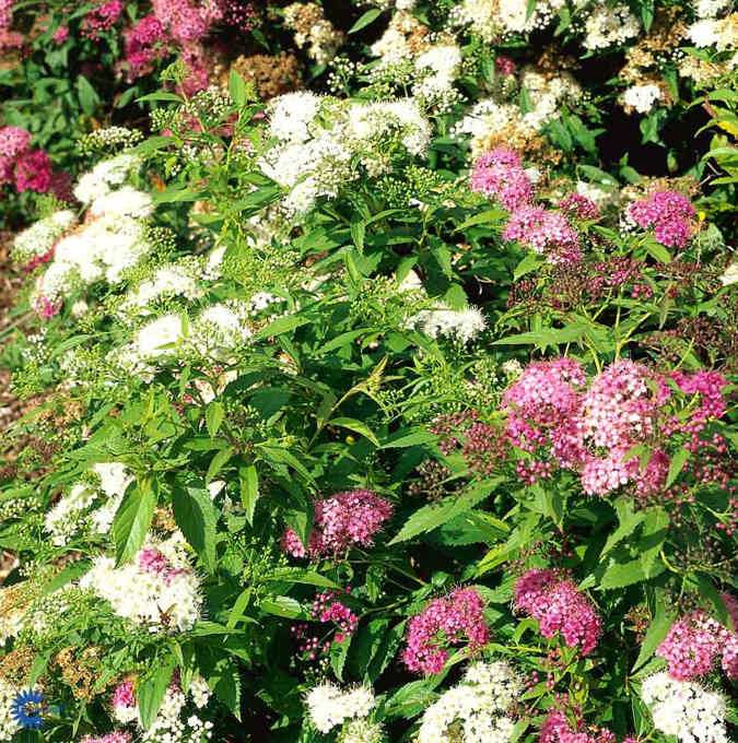 Lövfällande buske, ca. 60 cm hög med kompakt växtsätt. Bildar blommor i två färger. Några blir vita, andra rosa. Blommar från juni-augusti. Trivs i sol-halvskugga i vanlig trädgårdsjord. Kan klippas halv tillbaka tidigt på våren. Tidigare Shirobana. Zon 1-4. |
