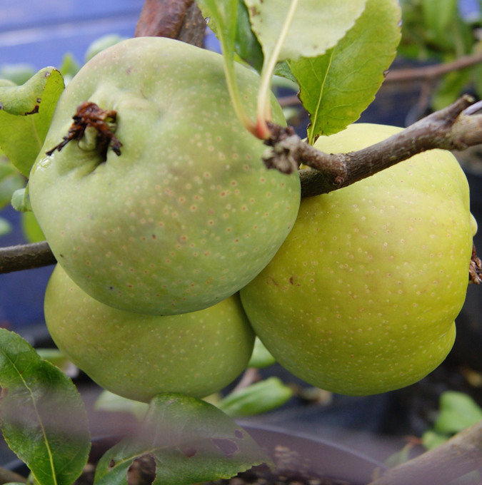 Lövfällande buske, ca 2 m hög, med svagt slingrande växtsätt. Ovala mörkgröna blad. Blommar med stora vita blommor i mars. Därefter bildas förhållandevis stora kvittenfrukter som kan skördas från september. Används till marmelad. Trivs i sol-halvskugga, inga speciella jordkrav. Zon 1-3. |