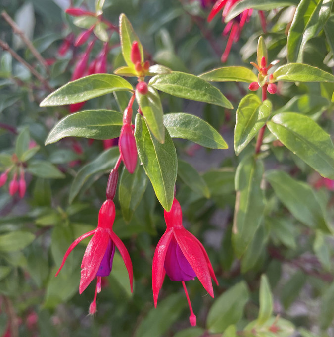 Buskig, 60 cm hög och lika bred, lövfällande fuchsia. Rikligt med hängande röda/violetta blommor från juni-oktober. Planteras i sol eller halvskugga på skyddad växtplats i vanlig väldränerad trädgårdsjord. Zon 1. |