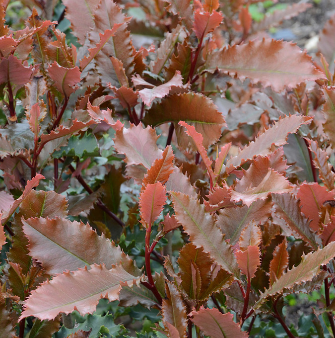 Vintergrön buske. Vackra blad med taggiga kanter och vacker brun/röd färg på nytillväxten. Växten blir ca 2 m hög och kan beskäras under hela växtsäsongen. Lämplig som häck, men passar även bra som solitär eller i kruka. Trivs i sol och halvskugga i väldränerad, näringsrik jord. Zon 1-2. |