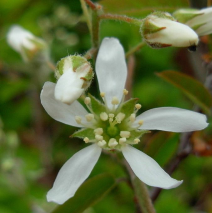 Lövfällande buske, ca 2-3 m hög. Vita blommor i april-maj. 1,5 cm stora saftiga välsmakande bär i juni. Härdig ner till -40 grader. Trivs i sol-halvskugga i vanlig väldränerad trädgårdsjord. Zon 1-6. |