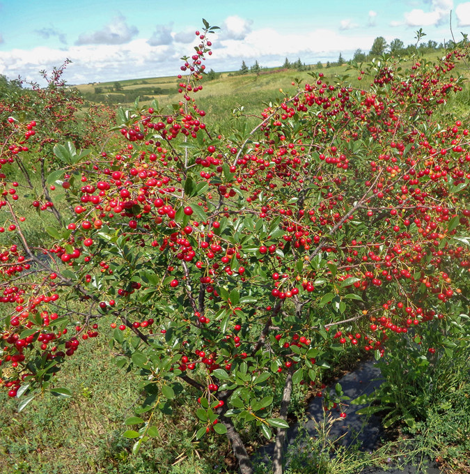Robust mörkrött surkörsbär som växer som buske upp till 2,5 meter hög. Vita blommor i maj. Självbefruktande. Stora bär och hög avkastning. Efter skörd skärs de gamla 3-4 åriga grenarna bort vid markytan. Frisk kanadensisk sort, lämplig för det nordiska klimatet. Bildar rotskott. |