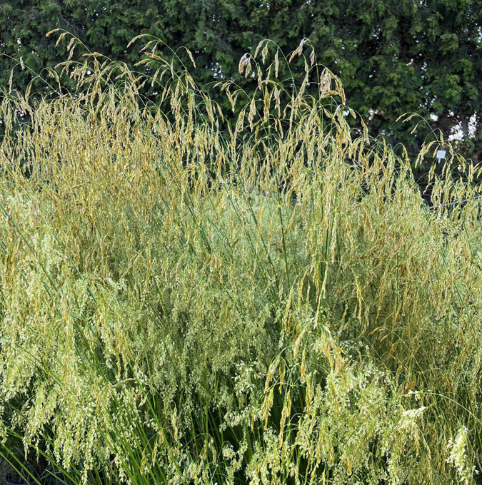 Tuvbildande, ca. 60 cm högt gräs. Skira gröngula ax, ca 120 cm höga, som övergår i guldgult. Blommar juni-augusti. Trivs i sol-halvskugga. Planteras i fuktig men väldränerad jord. Lättodlat och pålitligt gräs. Härdighet A. |
