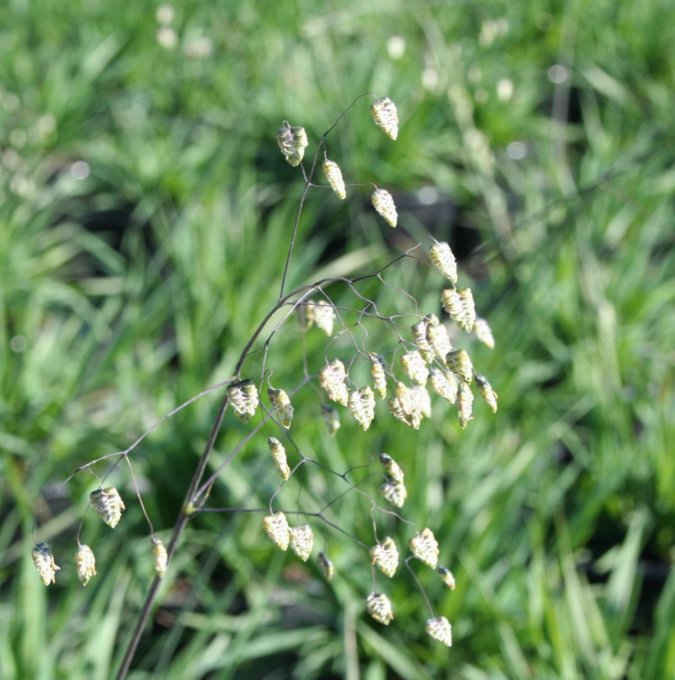 30-50 cm högt tuvbildande flerårigt gräs. Blommar i juni-juli med små gröna hjärtformad ax. Trivs i sol-halvskugga i vanlig väldränerad trädgårdsjord. Fullt härdig. Pasar även bra i krukor. Zon A. |