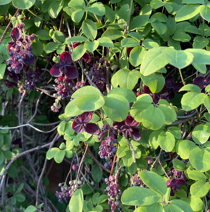 Snabbväxande, semi-städsegrön klätterväxt som kan nå 6 – 10 m. Blommar på våren med chokladfärgade, doftande små blommor. Kan bilda frukt om två sorter planteras. Ätlig skogsträdgårdsväxt. Är torktålig när den är väl etablerad. Placeras i sol eller skugga. Planteras i vanlig, väldränerad trädgårdsjord. Zon 1-2. |