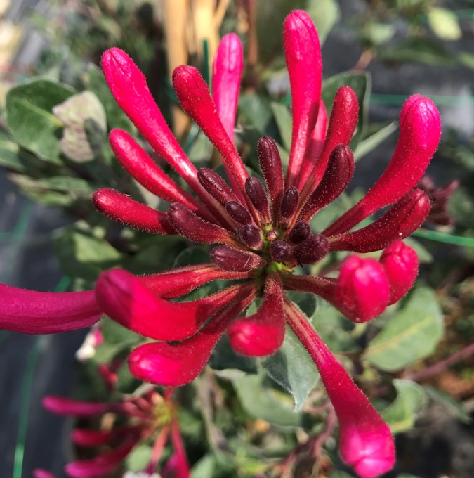 Klängväxt som blir 2 - 3 m hög. Blommar i juli - oktober med purpurröda blommor med gult. Stark doft! Blad- och blomstjälkar har en vinröd anstrykning. Trivs i sol-halvskugga. Lättodlad och anspråkslös. Zon 1-4. |