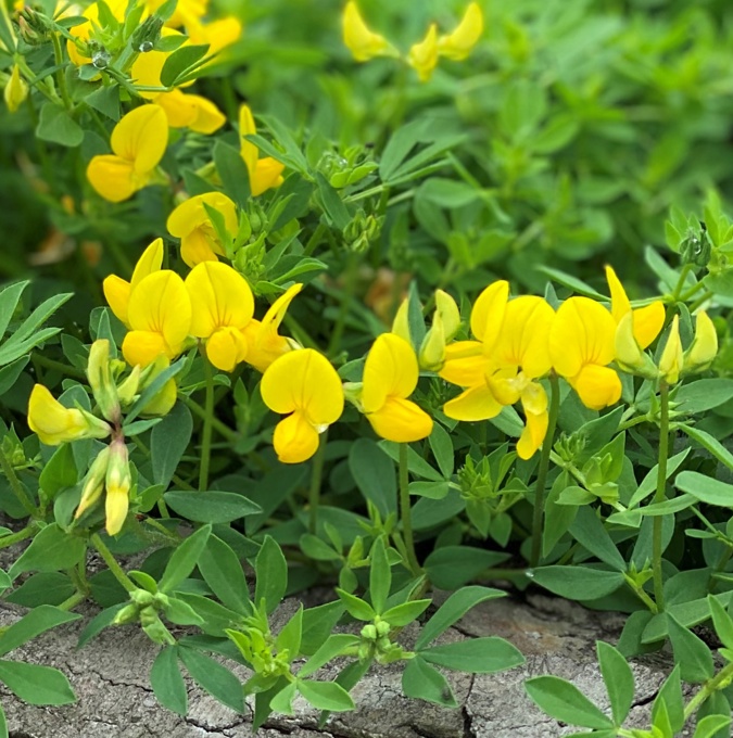 Vild växt. Ärtblomsliknande gula blommor i juni till augusti. Höjd 10-30 cm med liggande eller uppstickande skott. Sprider sig med både sidoskott och frö. Växer naturligt i öppna gräsmarker. Biologiskt värde: Värdefull för blåvingarna och flera andra dagfjärilar, som lägger sina ägg på växten. Zon 1-4. |