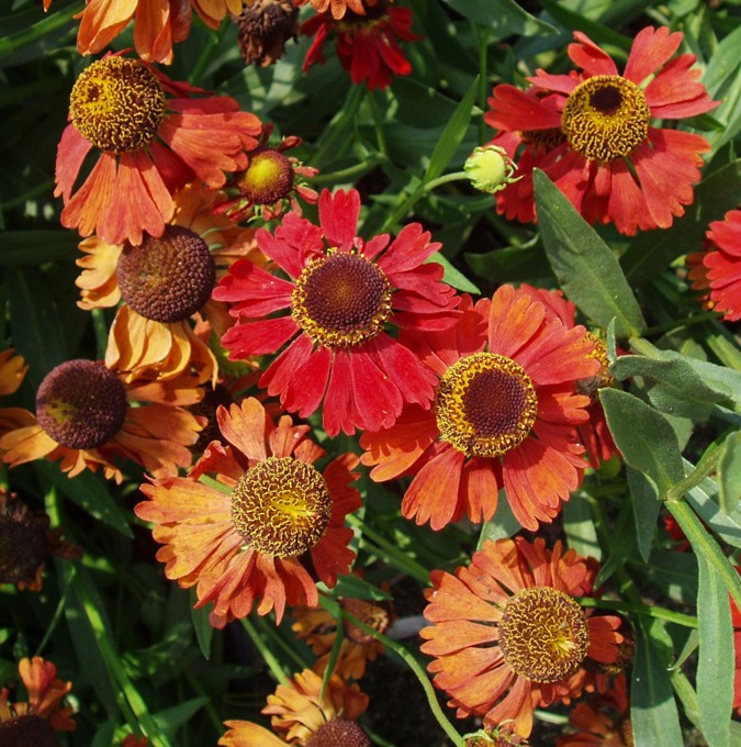 Perenn, ca. 90-100 cm hög som blommar i juli-september med stora kopparröda blommor med mörkare mitt. Rikblommande. Trivs i soligt läge i vanlig fuktig, men väldränerad jord. Kan behöva bindas upp. Bör delas regelbundet. Härdig. |
