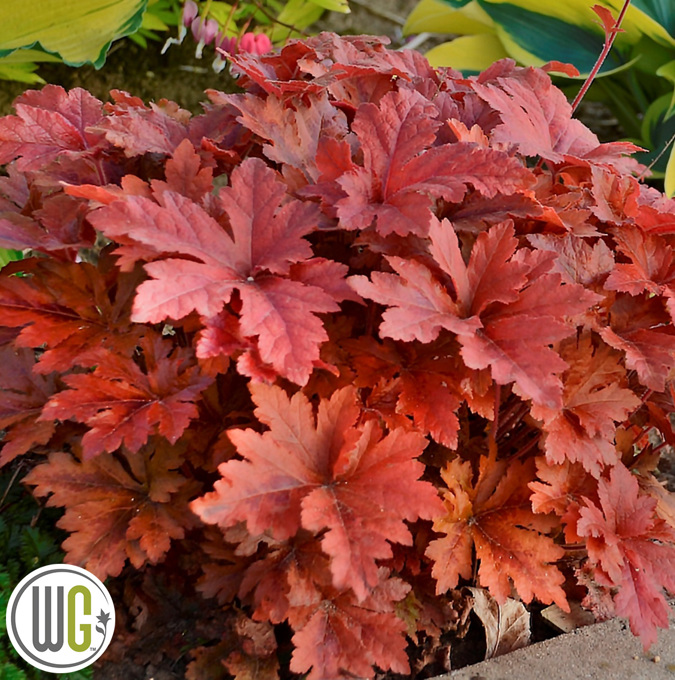 Perenn. Vackert flikiga blad i orange-röda färger. Blommor i cremevita nyanser i slutet på sommaren. Höjd 25cm, bredd 60cm. Växer i sol eller skugga i väldränerad jord. Värmetålig. Efterhanden som temperaturen stiger övergår bladfärgen i mer gröna nyancer. Biväxt. |