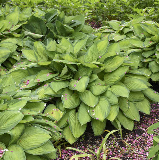 Flerårig växt med guldgula blad och mörkgröna kanter. Cirka 50 cm hög och cirka 60 cm bred. Blommar med lavendelblå blommor från midsommar. Trivs i skugga till halvskugga i fuktighetsbevarande, väldränerad jord. |