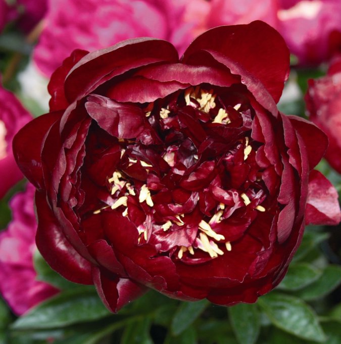 Perenn, 60-80 cm hög som blommar i juni-juli med stora, runda mörkröda, halvdubbla blommor. Stora blanka blad som får röda höstfärger. Trivs i sol-halvskugga på näringsrika jordar. Ska planteras grunt. Bra till snitt. Härdighet A. |
