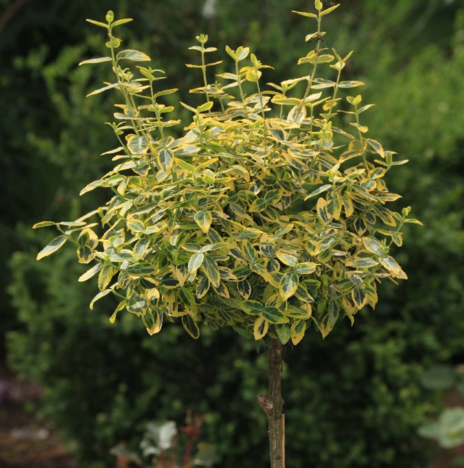 Litet toppympat träd med tät krona och städsegröna gulbrokiga blad. Växer i sol-skugga. Passar bra i rabatt eller kruka. Kan beskäras. Zon 1-4. |